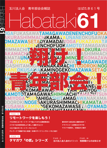 TOP > HABATAKIについて > HABATAKIバックナンバー HABATAKIバックナンバー 玉川法人会青年部会では、日々の活動報告や地域情報の発信を目的として、これまで長年にわたり会報誌「HABATAKI(はばたき)」を発行してまいりました。 本ページでは、過去に発行された会報誌のバックナンバーをPDF形式で公開しています。地域社会への貢献活動の記録をはじめ、玉川エリアで活躍する部会員の紹介(街の匠シリーズ)や、経営・生活に役立つ専門家のコラムなど、青年部会のこれまでの歩みと熱気が詰まった誌面をぜひご覧ください。 2023年 62号 2023年 61号 2022年 60号 2021年 59号 2020年 58号 2019年 57号 2019年 56号 2019年 55号 2019年 54号